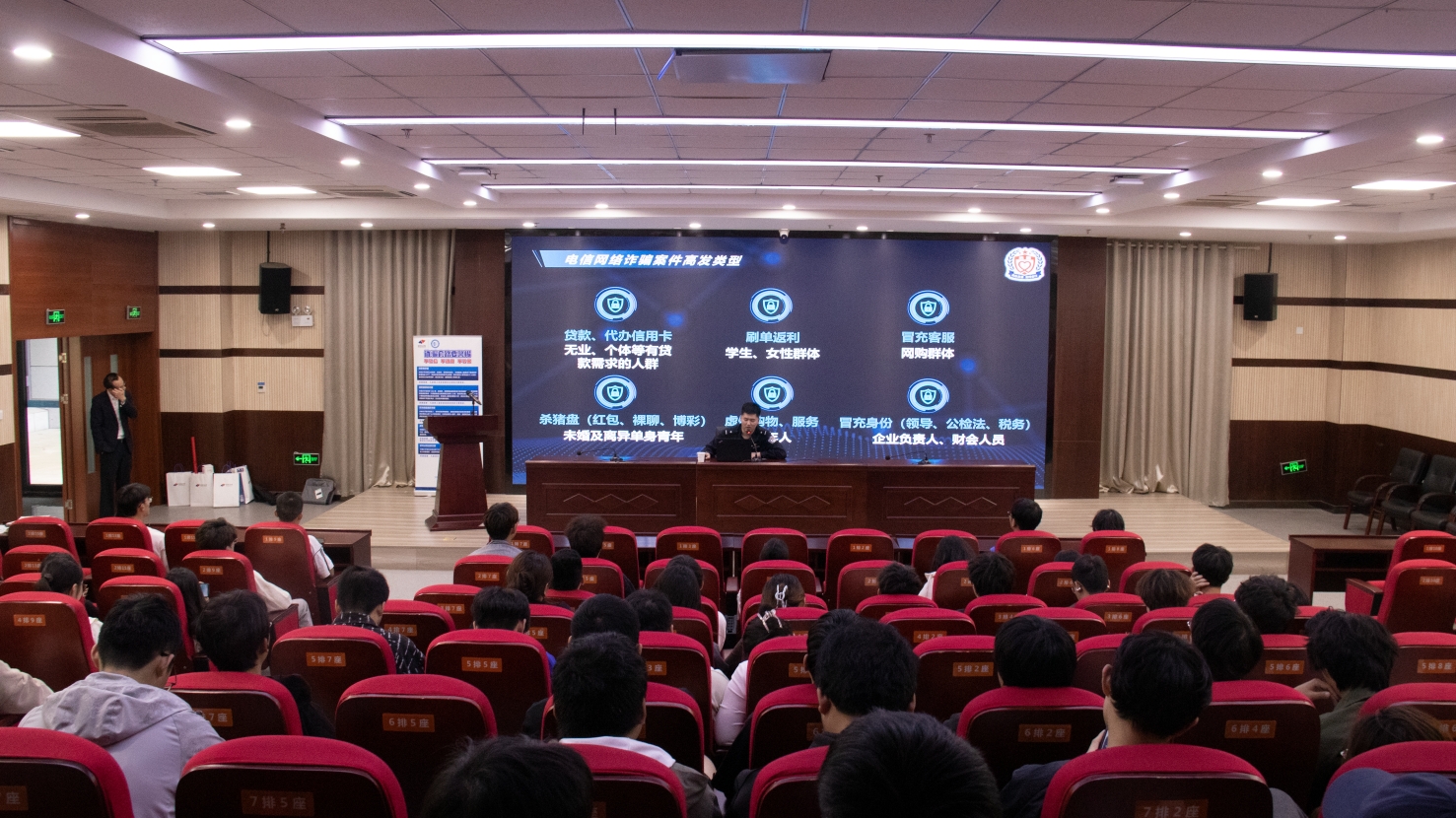 刘警官以一线办理反诈案件的数据向大家讲述校园电信网络诈骗案件的频发态势,深入浅出剖析了网络刷单、冒充熟人、游戏账号交易等高发诈骗类型,并针对大学生群体社会经验不足、防范意识薄弱的特点,详细讲解了应对策略和防范方法。接着,国信证券反诈宣讲员以校园贷款诈骗实际案例为题,分析校园贷、套路贷的套路和应对方法,引导大家果断拒骗防骗。