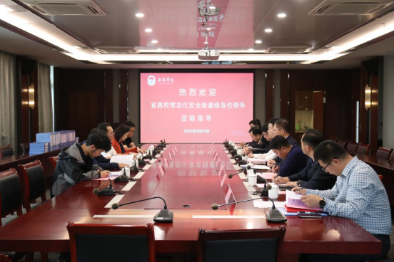 检查组组长谢建明传达省教育厅关于本次高校安全检查的指示精神、检查内容和检查流程,主要通过听取汇报、查阅台账、实地检查等形式对学校各项重点安全工作部署落实情况进行检查。